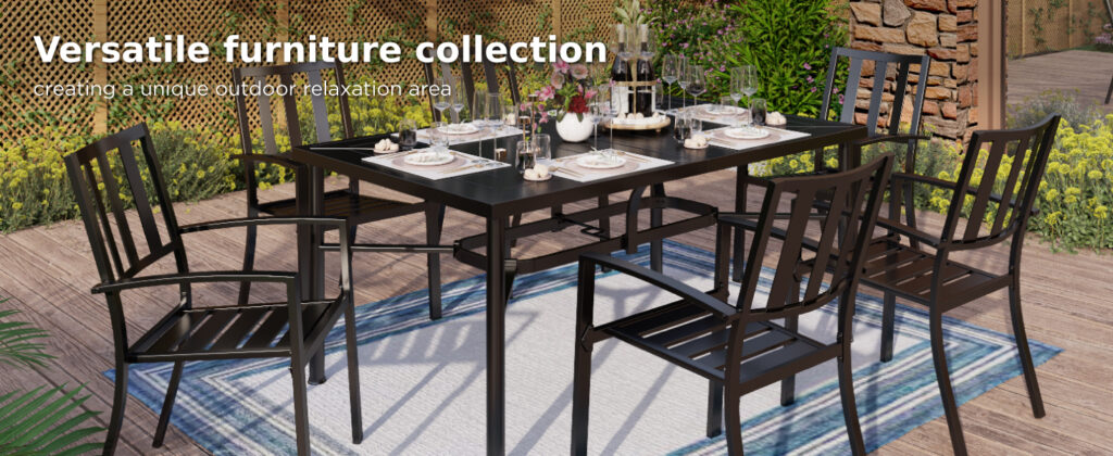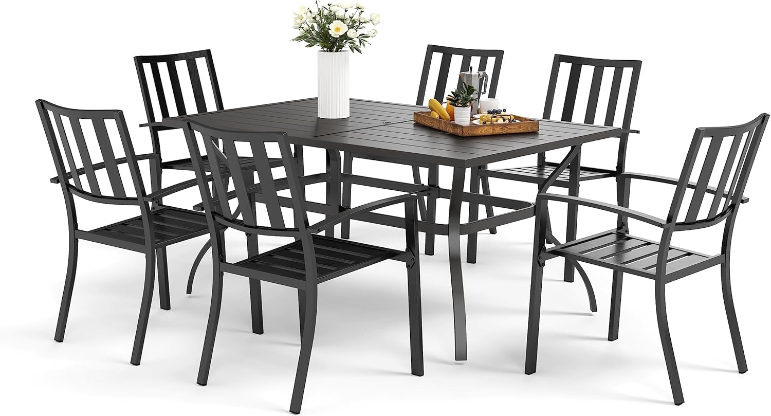 • Rectangular Metal Table – The large table measures L60″ x W38″, large enough for family dinners or small gatherings with friends to enjoy some quality time together; It features a 1.57″ umbrella hole to install an umbrella, protecting you and your family during hot summer or rainy days